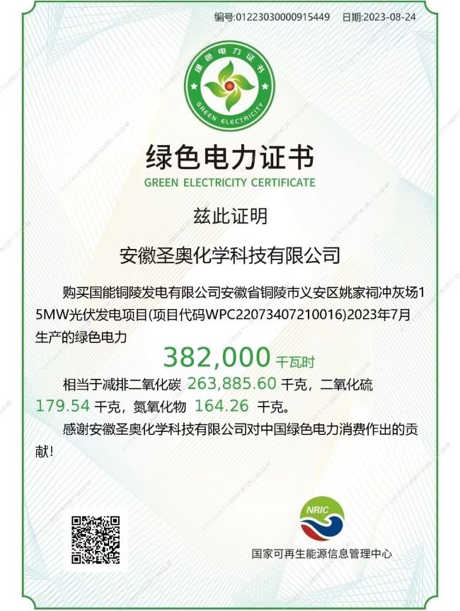 安徽圣奧獲得國(guó)家可再生能源信息管理中心核發(fā)的綠色電力證書,成為安徽省首批使用綠電企業(yè)