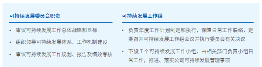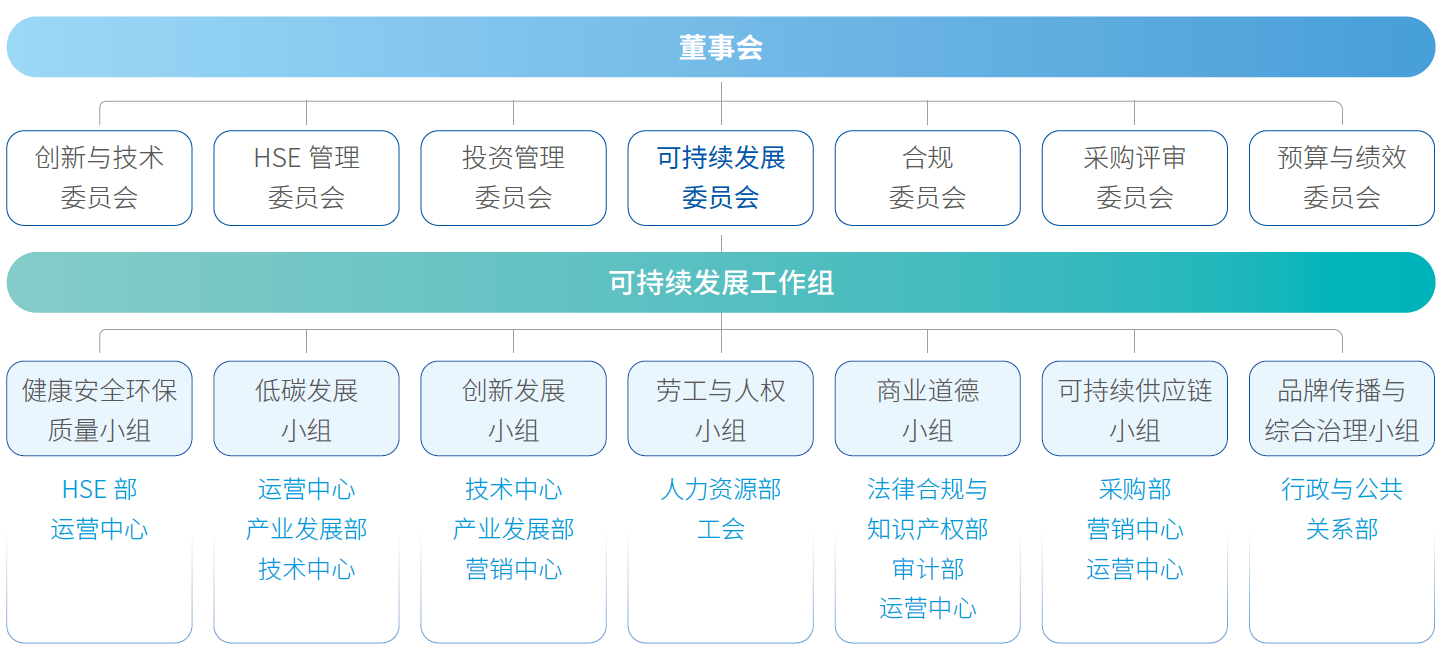 可持續(xù)發(fā)展委員會作為公司可持續(xù)發(fā)展工作主要責(zé)任機構(gòu),負責(zé)審議可持續(xù)發(fā)展工作總體戰(zhàn)略、目標(biāo)、整體規(guī)劃與績效等。委員會下設(shè)可持續(xù)發(fā)展工作組,由公司副總裁擔(dān)任組長,組員包括相關(guān)部門負責(zé)人??沙掷m(xù)發(fā)展工作組下設(shè)健康安全環(huán)保質(zhì)量、低碳發(fā)展、創(chuàng)新發(fā)展、勞工與人權(quán)、商業(yè)道德、可持續(xù)供應(yīng)鏈、品牌傳播與綜合治理共7個工作小組,包含HSE部、運營中心、產(chǎn)業(yè)發(fā)展部、技術(shù)中心、營銷中心、人力資源部、工會、法律合規(guī)與知識產(chǎn)權(quán)部、審計部、采購部、行政與公共關(guān)系部等主要職能部門,對公司可持續(xù)發(fā)展事宜承擔(dān)具體責(zé)任,每年檢討具體議題可持續(xù)發(fā)展政策及目標(biāo)完成情況。