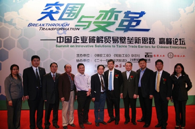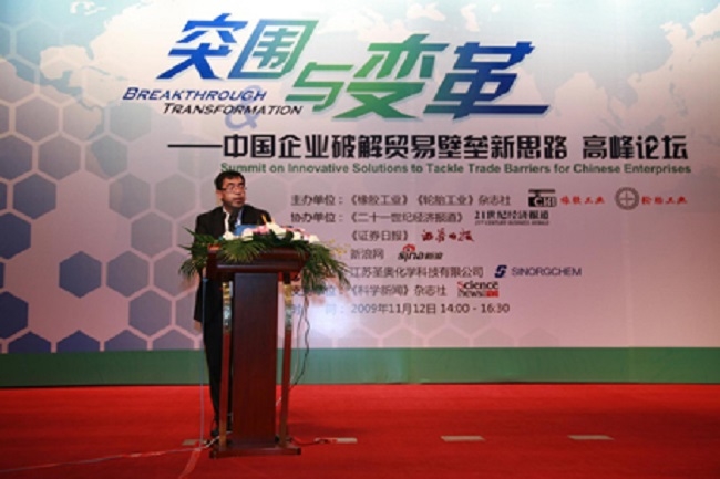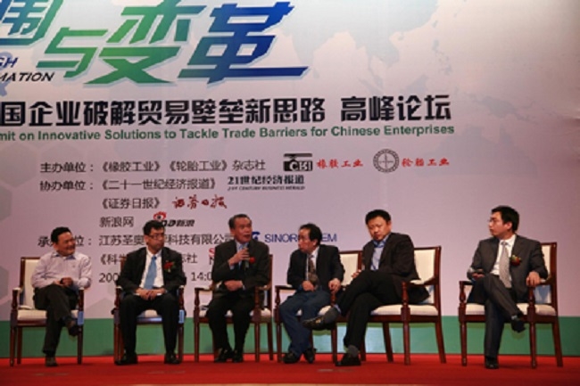 (2009年11月12日,上海)今年4月中國輪胎工業(yè)遭遇了美國輪胎特保案,在全球經(jīng)濟危機的背景下,其不利影響持續(xù)發(fā)酵。而貿(mào)易保護(hù)主義成為了世界許多國家盲目應(yīng)對經(jīng)濟危機的一個舉措,再一次沖擊了中國輪胎在世界市場上的地位和份額。在此形勢下,11月12日,江蘇圣奧化學(xué)科技有限公司(簡稱“江蘇圣奧”)在上海舉辦了一場主題為“突圍與變革——中國企業(yè)破解貿(mào)易壁壘新思路”的高峰論壇。