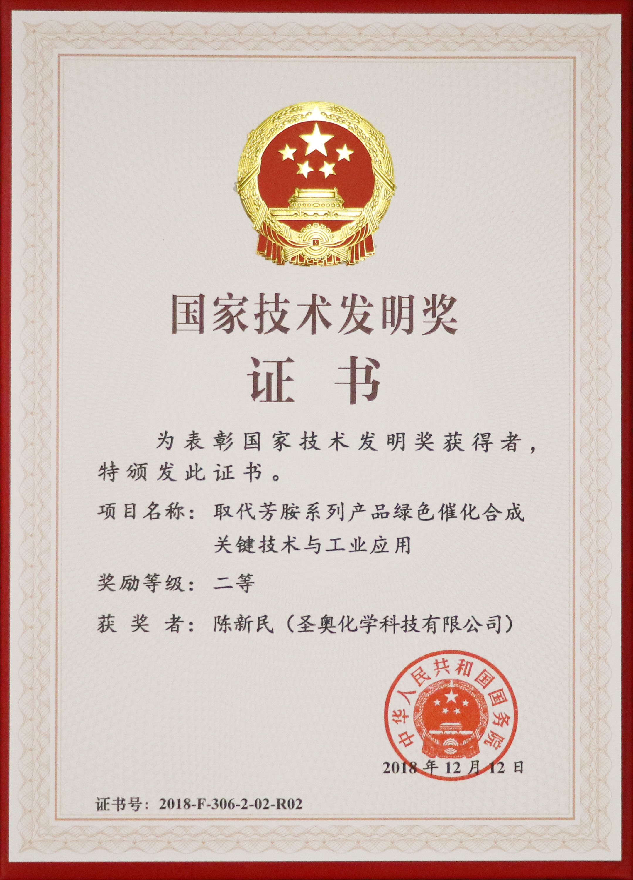 1月8日,2018年度國(guó)家科學(xué)技術(shù)獎(jiǎng)勵(lì)大會(huì)在北京人民大會(huì)堂隆重舉行,對(duì)為我國(guó)科學(xué)技術(shù)進(jìn)步、經(jīng)濟(jì)社會(huì)發(fā)展、國(guó)防現(xiàn)代化建設(shè)作出突出貢獻(xiàn)的科學(xué)技術(shù)人員和組織給予獎(jiǎng)勵(lì)。由圣奧化學(xué)參與完成的“取代芳胺系列產(chǎn)品綠色催化合成關(guān)鍵技術(shù)與工業(yè)應(yīng)用”項(xiàng)目榮獲2018年度國(guó)家技術(shù)發(fā)明獎(jiǎng)二等獎(jiǎng)。