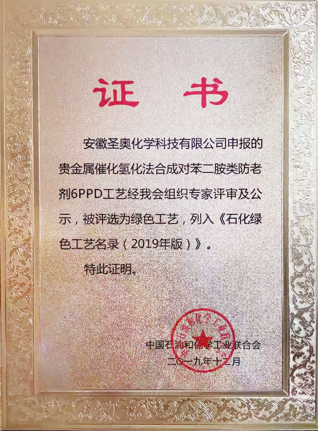 為推廣先進(jìn)綠色工藝技術(shù)在石油和化工行業(yè)的應(yīng)用,進(jìn)一步發(fā)揮《石化綠色工藝名錄》對行業(yè)“綠色”發(fā)展的引導(dǎo)作用,根據(jù)國家發(fā)展改革委工作部署,12月31日,中國石油和化學(xué)工業(yè)聯(lián)合會在京發(fā)布《石化綠色工藝名錄(2019年版)》,圣奧化學(xué)“貴金屬催化氫化法合成對苯二胺類防老劑6PPD工藝”被收錄在內(nèi)。