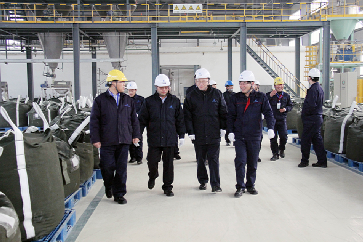 江蘇圣奧董事長覃衡德首先實地檢查了山東圣奧生產(chǎn)基地的主要生產(chǎn)區(qū)、DCS主控室等,重點查看了生產(chǎn)區(qū)域內(nèi)的安全消防管理、綠色環(huán)保工作,并對新項目不溶性硫磺車間作了深入調(diào)研,詳細了解了不溶性硫磺車間的生產(chǎn)現(xiàn)狀、安全設施建設、裝置改造運行和產(chǎn)品質(zhì)量等。