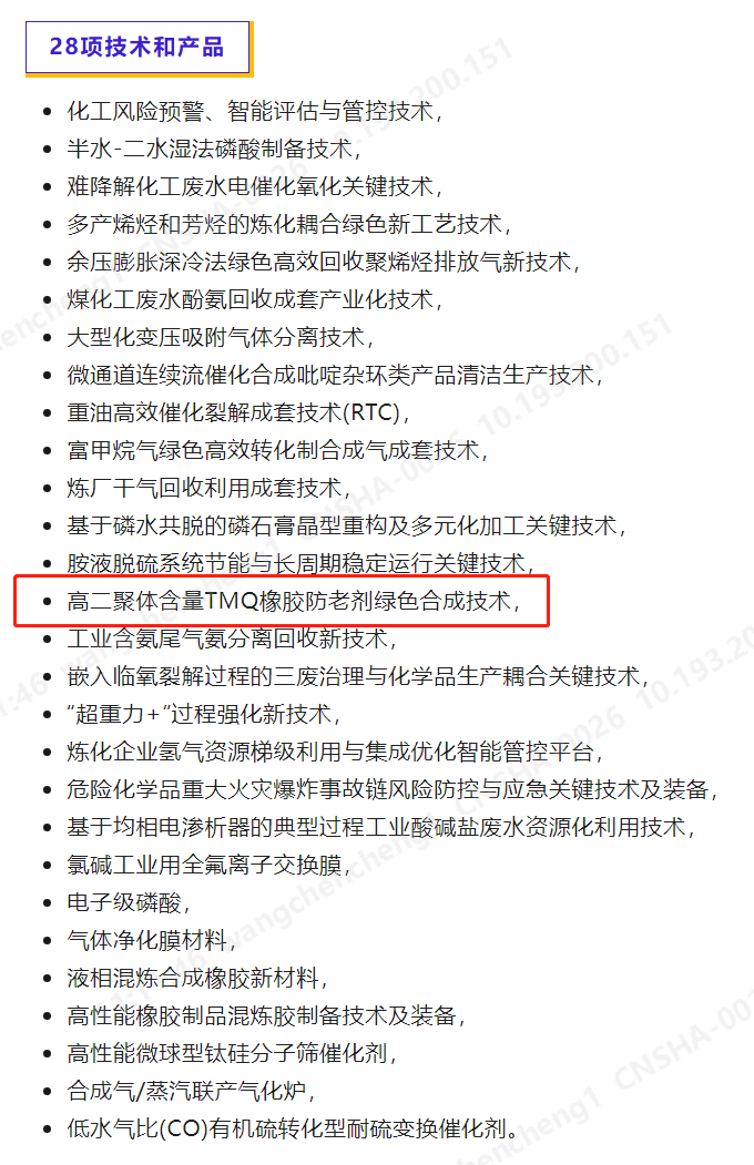 8月7日,國家工業(yè)和信息化部網(wǎng)站正式公布了第二批石化化工行業(yè)鼓勵推廣應(yīng)用的技術(shù)和產(chǎn)品目錄,共有28項技術(shù)和產(chǎn)品進入目錄,圣奧化學(xué)“高二聚體含量TMQ橡膠防老劑綠色合成技術(shù)”入選,為推動石化化工產(chǎn)業(yè)高端化、智能化、綠色化轉(zhuǎn)型升級提供了堅實的技術(shù)支撐,該技術(shù)還曾榮獲2022年度石化聯(lián)合會科技進步二等獎、2021年度中國中化科技進步三等獎。