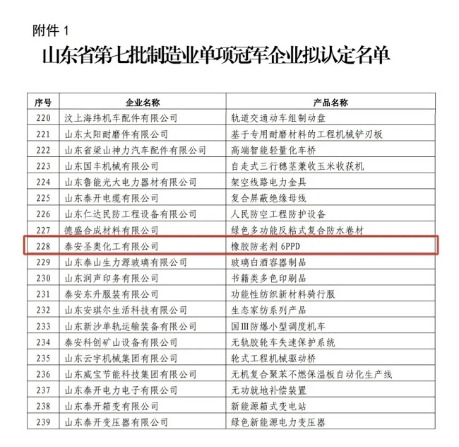 11月10日,山東省工業(yè)和信息化廳第七批山東省制造業(yè)單項(xiàng)冠軍企業(yè)擬認(rèn)定名單結(jié)束公示期,泰安圣奧成功入選。
