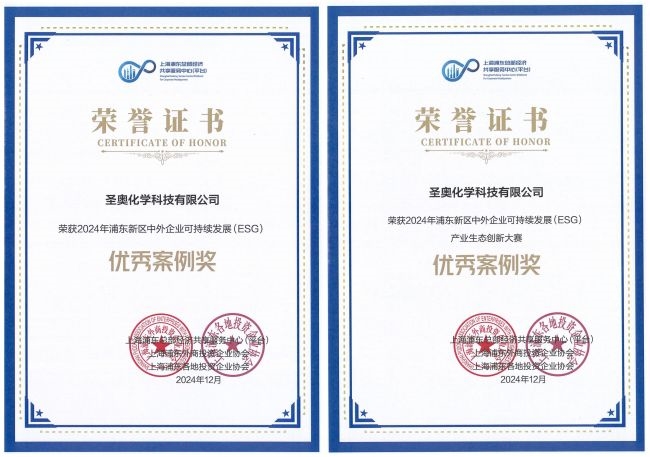 12月12日下午,“聚焦可持續(xù) 塑造新動能”浦東總部經濟生態(tài)構建與可持續(xù)發(fā)展(ESG)主題活動在上海中心舉辦,圣奧化學ESG實踐案例“‘綠’見未來,前瞻布局、積極響應客戶減碳需求”榮獲“2024年浦東新區(qū)中外企業(yè)可持續(xù)發(fā)展(ESG)優(yōu)秀案例獎”和“2024 年浦東新區(qū)中外企業(yè)可持續(xù)發(fā)展(ESG)產業(yè)生態(tài)創(chuàng)新大賽優(yōu)秀案例獎”。