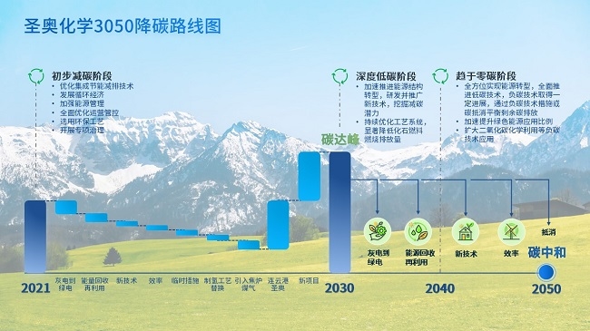圣奧化學(xué)圍繞碳中和目標(biāo)宣布降碳時(shí)間表,“力爭于2030年實(shí)現(xiàn)碳達(dá)峰,2050年實(shí)現(xiàn)碳中和”,通過三個(gè)階段變革重塑發(fā)展模式,制定“2021-2030初步減碳,2030-2040深度低碳,2040-2050趨于零碳”的降碳路線圖。